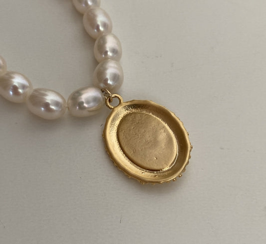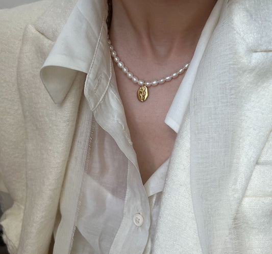 "This pearl necklace, with its minimalist design and a playful rose-patterned pendant, strikes the perfect balance between elegance and whimsy, making it a versatile accessory for any occasion."